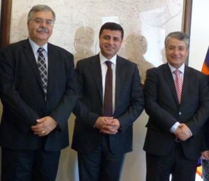 Ձախէն՝ Հ.Յ.Դ. Բիւրոյի անդամ Յակոբ Տէր Խաչատուրեան, Թուրքիոյ քրտամէտ Խաղաղութիւն եւ Ժողովրդավարութիւն կուսակցութեան (BDP) համանախագահ Սալահէտտին Տէմիրթաշ եւ նոյն կուսակցութեան արտաքին յարաբերութիւններու պատասխանատու, Վանէն ընտրուած Թուրքիոյ խորհրդարանի անդամ Նազմի Կիւր, Հայ Դատի Յանձնախումբի Ուաշինկթընի գրասենեակին մէջ, 29 Հոկտեմբեր 2013