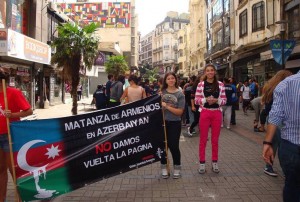Ահա Մօնթէվիտէոյի այդ բաժնի մէջ, նախաձեռնութեամբ ՀՅԴ Արմենիա Երիտասարդական Միութեան Վարչութեան, առաջին անգամ ըլլալով հրապարակային բողոքի ցոյց մը կատարուեցաւ։ Իւրօրինակ կ’ըսենք, քանի որ իսկապէս մեր տղաքն ու աղջիկները նորութիւն մը բերին որ ուշադրութիւնը գրաւեց բոլոր անցորդներուն։ Փողոցի կեդրոնը, սալայատակի վրայ, անոնք ամրացուցին բաց գրքեր, ուր կ’երևան Սումկայթ քաղաքի մէջ խոշտանքուած և վայրի կերպով սպաննուած հայերու լուսանկարներ և ամէնէ յատկանշականը այն էր որ այդ երկու երեսի վրայ բացուած գրքերու մէջտեղէն թելերով կապուած էին սև փուչիկներ, խորհրդանշելով մեր սուգը։