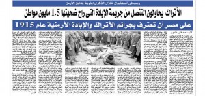 «Ա.».-Հետաքրքրական եւ ուշագրաւ էր, որ այս տարի եգիպտական մամուլը տարբեր յօդուածներով, ակնարկներով եւ տեղեկագրութիւններով լուսարձակի տակ առաւ Հայոց ցեղասպանութիւնը: Այդ մէկը ըրին նաեւ հիմնական օրաթերթերը: Անդրադառնանք այս երեւոյթին, այս իմաստով Հայ դատի մարմինի աշխատանքին:
