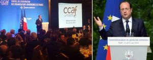 [1]Ֆրանսիայի նախագահ Ֆրանսուա Օլանդի ներկայությունը Ֆրանսիայի հայկական կազմակերպությունների համակարգող խորհրդի (CCAF) ամենամյա ընթրիքին բացառիկ քաղաքական զորակցության նշան էր: Իր ներկայությամբ Ֆրանսիայի նախագահը հայտարարեց, որ իր պաշտոնական աջակցությունն է ցուցաբերում հայերին Հայոց ցեղասպանության 100-րդ տարելիցի կապակցությամբ:
