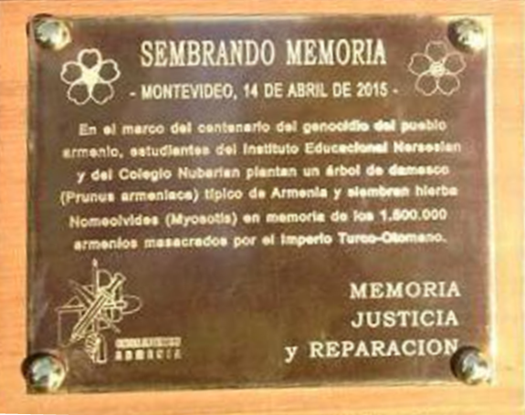 Նախաձեռնութեամբ ՀՅԴ Արմենիա Երիտասարդական միութեան, Ուրուկուահայ զոյգ վարժարաններու աշակերտներէն խումբ մը, Ապրիլ 14ին, յուզիջ արարողութեամբ մը, Բուսաբանական Այգիի մէջ, որպէս յարգանք մեր բիւրաւոր նահատակներուն և Հայոց Ցեղասպանութեան 100-ամեակին կատարւող ձեռնարկներու ծիրեն ներս, Ծիրանի ծառ մը տնկեցին և Անմոռուկ ծաղիկի սերմեր ցանեցին։