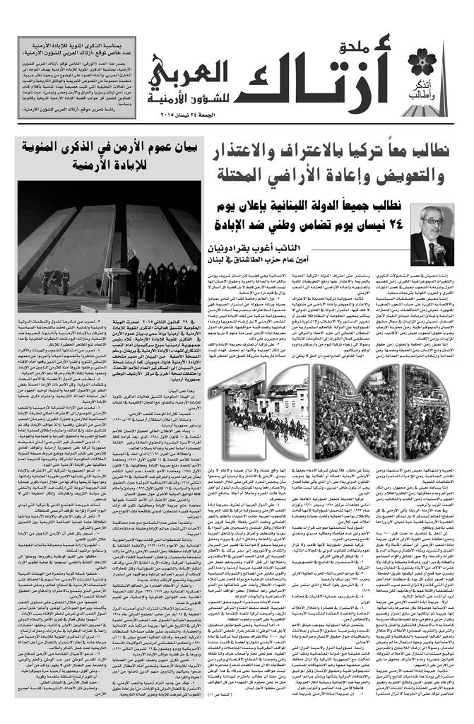 «Ազդակ»-ի արաբերէն բաժանմունքը, Հայոց ցեղասպանութեան 100-ամեակին առիթով մօտ օրէն կը հրատարակէ «Ազդակ»-ի չափով 12 էջնոց թիւ մը: «Ազդակ»-ի արաբերէն կայքը կը շարունակէ առօրեայ կշռոյթով տեղադրել Ցեղասպանութեան հետ առնչուած ձեռնարկներուն եւ քաղաքական զարգացումներուն հետ առնչուած մանրամասնութիւնները` միաժամանակ նկատի ունենալով թէ՛ արաբական աշխարհի եւ թէ՛ արաբալեզու հայ ընթերցողները: