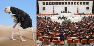 Այսպէս, գլուխնին հողին տակ, այս նորելուկ ղեկավարները, որոնք կը պատկանին ազգայնամոլ «Արդարութիւն եւ Բարգաւաճում» (AKP) եւ փանթուրքիզմի համար պայքարող «Գորշ Գայլեր»ու քաղաքական թեւը հանդիսացող՝ «Ազգայնական շարժում» (MHP) կուսակցութիւններուն, կը կարծեն կամ կ՛ենթադրեն, թէ կրցած են իրենց ամբողջ մարմնով պահուըտիլ եւ այսպէս աշխարհին ցոյց տալ թէ երկիրը կ՛ընդանայ արդարօրէն եւ ամենայն բարգաւաճութեամբ: