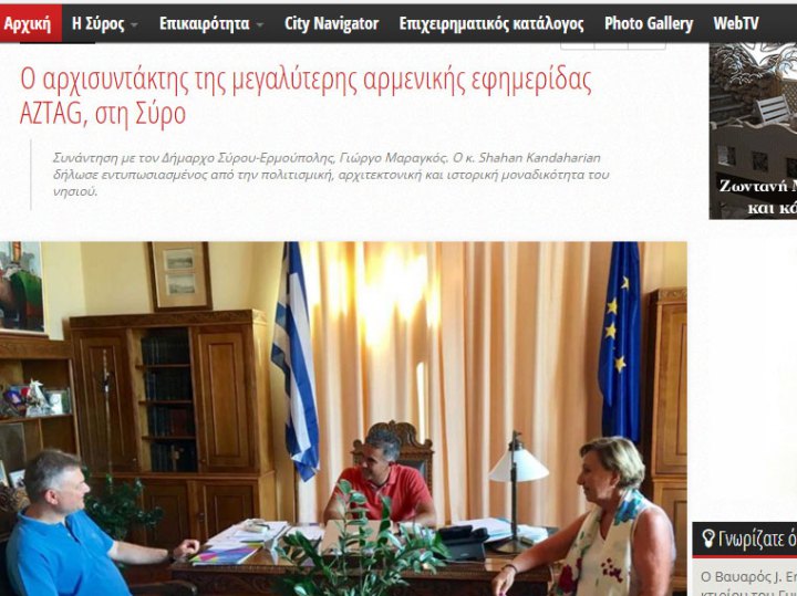 Այժմ կեդրոնանանք հայկական առումով կղզիին ներկայացուցած կարեւորութեան, որուն մանրամասնութիւններուն մասին առիթ եղած է զրուցելու «Ազդակ»-ի տնօրէնին եւ Սիրոյի քաղաքապետին միջեւ կայացած հանդիպումին ընթացքին: Յունարէնէն հայերէն եւ փոխադարձաբար թարգմանութիւնը կատարեց Զարմինէ Քիւրտօղլեանը: