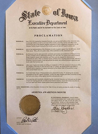 ԱՄՆ Այովա նահանգի նահանգապետ Քիմ Ռեյնոլդսը քիչ առաջ հռչակագիր է ստորագրել, որով ճանաչում է Հայոց ցեղասպանությունը: