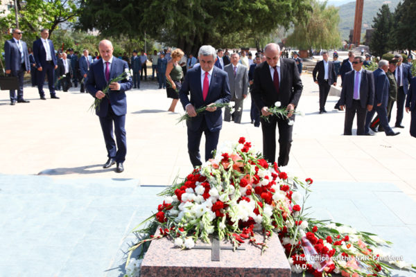 Հայկական երկու պետությունների ղեկավարներն այցելել են Ստեփանակերտի հուշահամալիր եւ ծաղկեպսակներ ու ծաղիկներ դրել Արցախի անկախության ու ազատության համար զոհված ազատամարտիկների, Ազգային ժողովի առաջին նախագահ Արթուր Մկրտչյանի շիրիմներին: