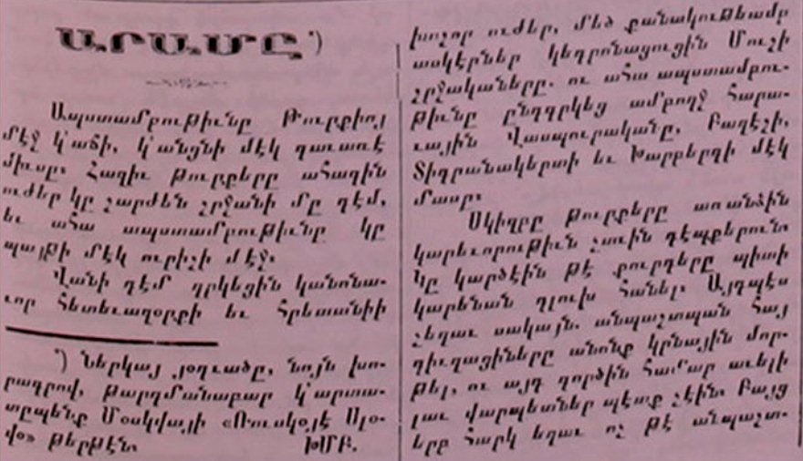 Ստորեւ կը հրապարակենք Սոֆիայի մէջ հրատարակուող «Հայաստան» թերթի 3 յունիս 1915-ի 24-րդ թիւին մէջ լոյս տեսած յօդուած մը, որուն խմբագրութիւնը օրին շափոյով մը տեղեկացուցած էր, որ զայն արտատպած եւ թարգմանած է Մոսկուայի «Ռուսկոյէ Սլովօ» թերթէն: