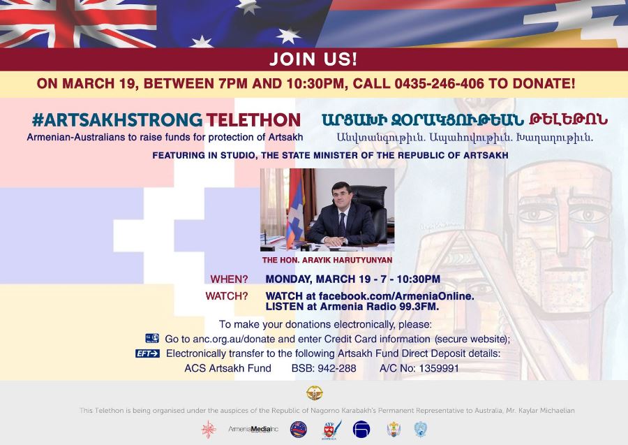 Հովանաւորութեամբ Աւստրալիոյ մէջ Արցախի Հանրապետութեան մշտական ներկայացուցչութեան գրասենեակին եւ կազմակերպութեամբ ՀՅԴ Աւստրալիոյ Կեդրոնական Կոմիտէի, ՀՕՄ-ի, Համազգայինի եւ ՀՄԸՄ-ի Շրջանային Վարչութիւններու, Աւստրալիոյ Հայ Դատի յանձնախումբին, ՀՅԴ Աւստրալիոյ Երիտասարդական Միութեան եւ Արմենիա Մետիա մամլոյ եւ տեղեկատուական ընկերակցութեան, Երկուշաբթի 19 Մարտ 2018-ին տեղի պիտի ունենայ «Զօրակցինք Արցախին» խորագրով թելեթոն մը: