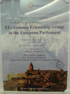 Պրիւքսել, 9 յունուար 2013.- Այսօր Եւրոպական Միութեան խորհրդարանի շէնքէն ներս, պաշտօնապէս յայտարարուեցաւ Եւրոպական խորհրդարան – Հայաստան բարեկամական խումբի ստեղծումը, նախագահութեամբ դոկտ. Էլենի Թէոխարուսի (Եւրոպայի Ժողովրդական Կուսակցութիւն, Կիպրոս), եւ ներկայութեամբ ՀՀ Ազգային ժողովի 25-անդամ պատուիրակութեան մը, նախագահ Յովիկ Աբրահամեանի գլխաւորութեամբ։ Բարեկամութեան խումբի ստեղծման ներկայ էր նաեւ Եւրոմիութեան կրթութեան, մշակոյթի, բազմալեզուականութեան եւ երիտասարդական հարցերու յանձնակատար տիկին Անտրուլա Վասիլիու։ Բացումի պաշտօնական խօսքերուն յաջորդեց հիւրասիրութիւն մը, ներկայ պելճիքահայ կազմակերպութիւններու ներկայացուցիչներուն եւ անձնաւորութիւններուն համար։