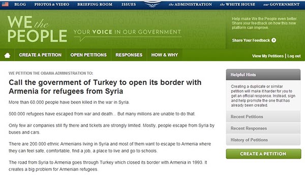 ԱՄՆ նախագահի վարչակազմի կայքում մեկնարկել է ստորագրահավաք, որով նախագահ Օբամային առաջարկվում է կոչ անել Թուրքիայի իշխանություններին բացել Հայաստանի հետ սահմանը` սիրիահայերին հնարավորություն տալով առավել հարմար ու կարճ ճանապարհով հայրենիք հասնելու: