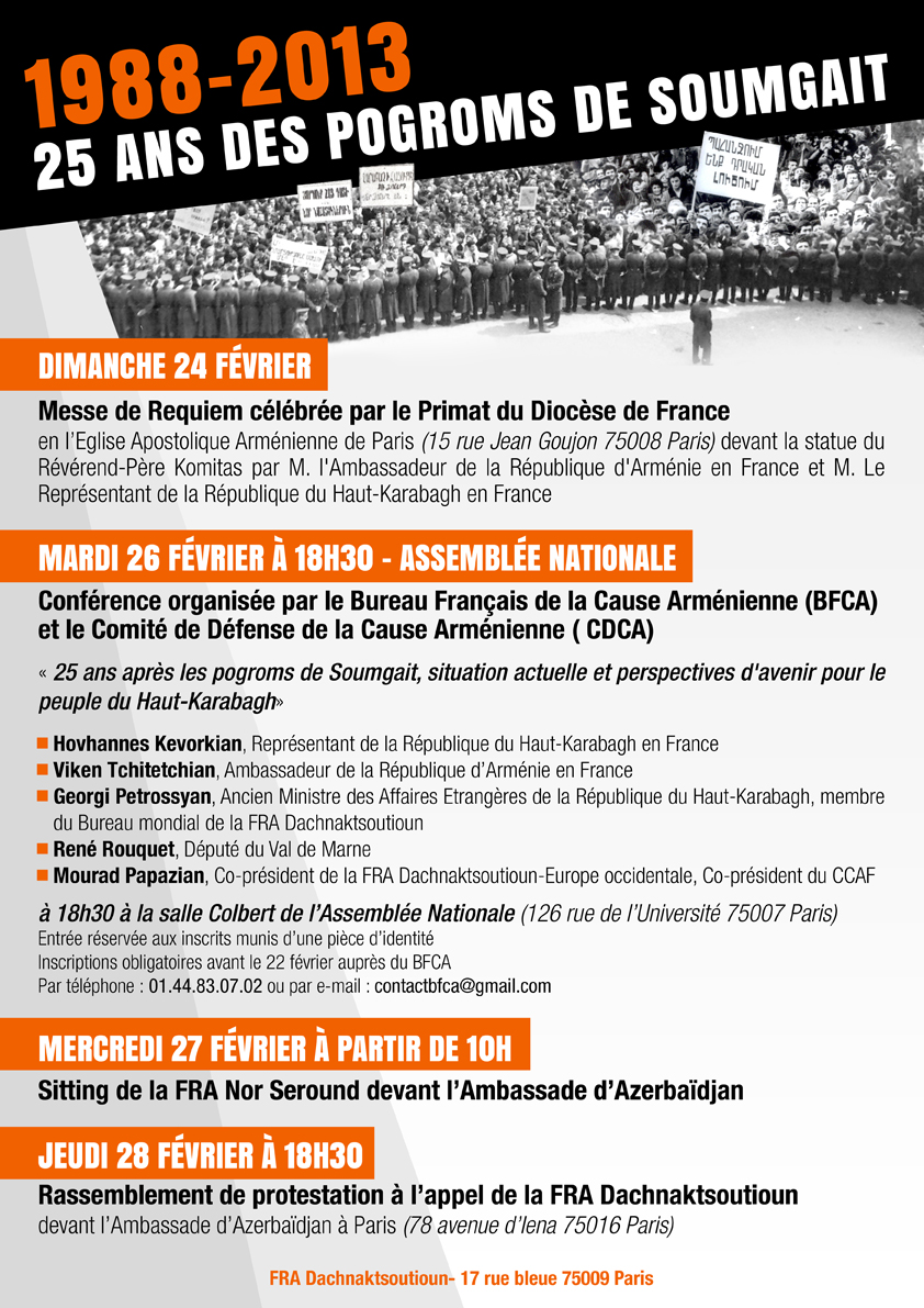Սումկայիթեան սպանդի 25 ամեակին առիթով, Հայ Յեղափոխական Դաշնակցութիւնը Փարիզի մէջ երեք տարբեր նախաձեռնութիւններով, ինչպէս նաեւ` զուգահեռ քաղաքական հանդիպումներով, լուսարձակի տակ կ’առնէ այս իրադարձութիւնը եւ համաժողովրդային բնոյթ կու տայ անոր :