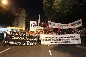 [1]ՊՈՒԷՆՈՍ ԱՅՐԷՍ («Արմենիա» թերթ).- Չորեքշաբթի, Ապրիլ 24ի երեկոյեան, Արժանթինի մայրաքաղաք՝ Պուէնոս Այրէսի հայութիւնը ընդառաջեց համայնքի երիտասարդական միութիւններու նախաձեռնութեան, որ Հայոց Ցեղասպանութեան 98ամեակի առիթով կազմակերպած էր քայլարշաւ մը դէպի Թուրքիոյ Դեսպանատուն։ Այսպէս, հոծ բազմութիւն մը ներկայ գտնուեցաւ Պուէնոս Այրէսի Իրաւաբանութեան Պետական Համալսարանի մուտքին, ուրկէ ջահերով, պաստառներով եւ դրօշակներով ուղղուեցաւ դէպի Թուրքիոյ Դեսպանատուն, մինչ երիտասարդները բարձրախօսներով կ’արտայայտէին պահանջատիրական լոզունգներ։